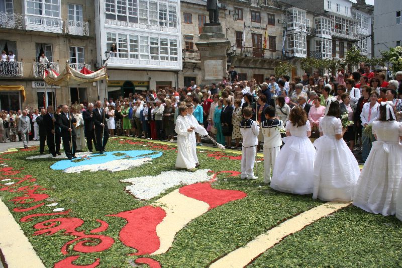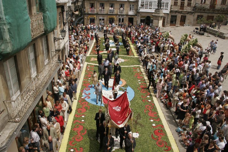 Imagen de la Procesión del Corpus Christi en Viveiro sobre las Alfombras de Flores confeccionadas por la Hermandad de la Santa Cruz y colaboradores.