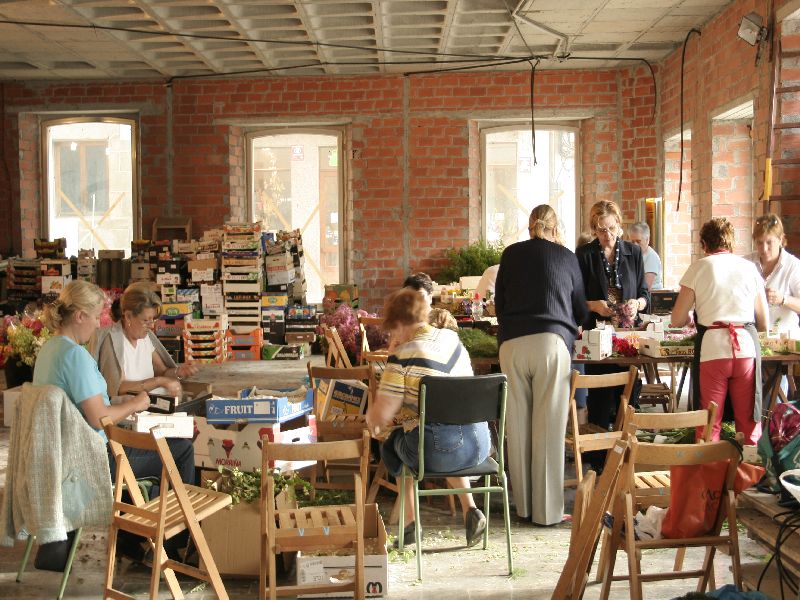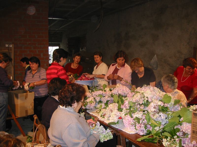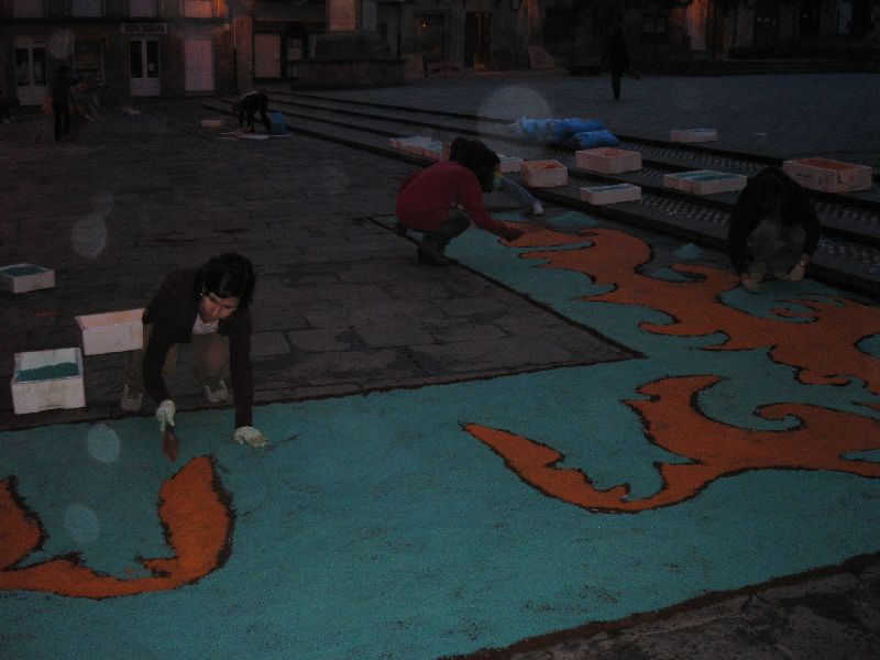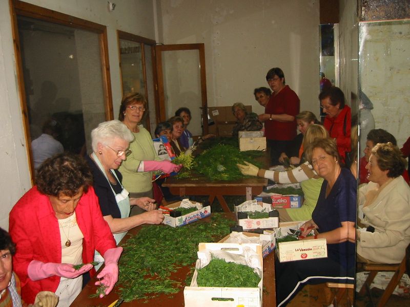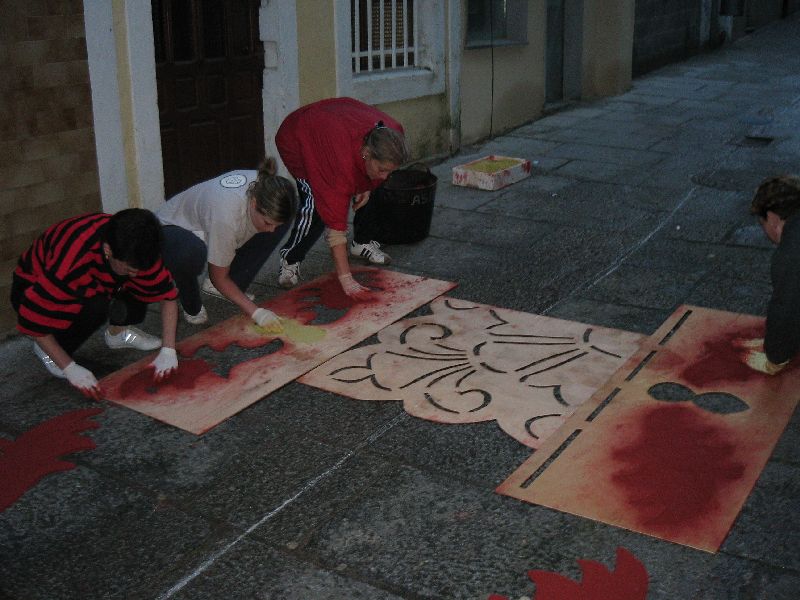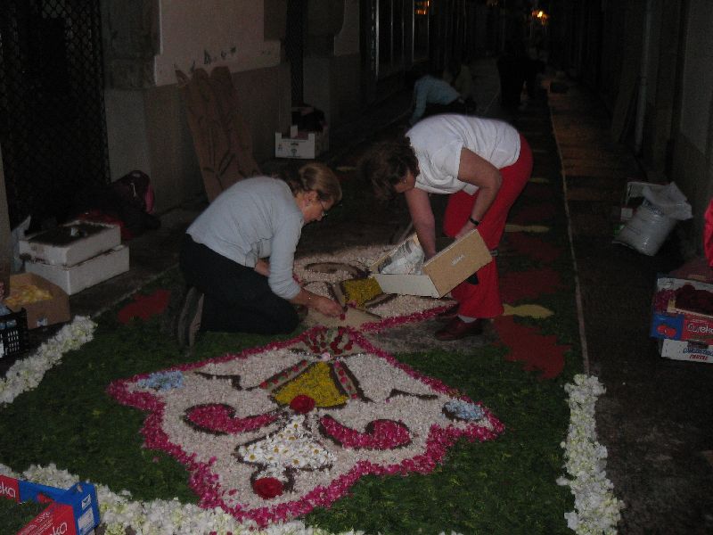 La noche anterior al Corpus, trabajamos ininterrumpidamente hasta la mañana para tener todo a punto para la Procesión. A veces con las inclemencias del tiempo en contra, pero nos sentimos orgullosas una vez visto el trabajo realizado.