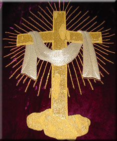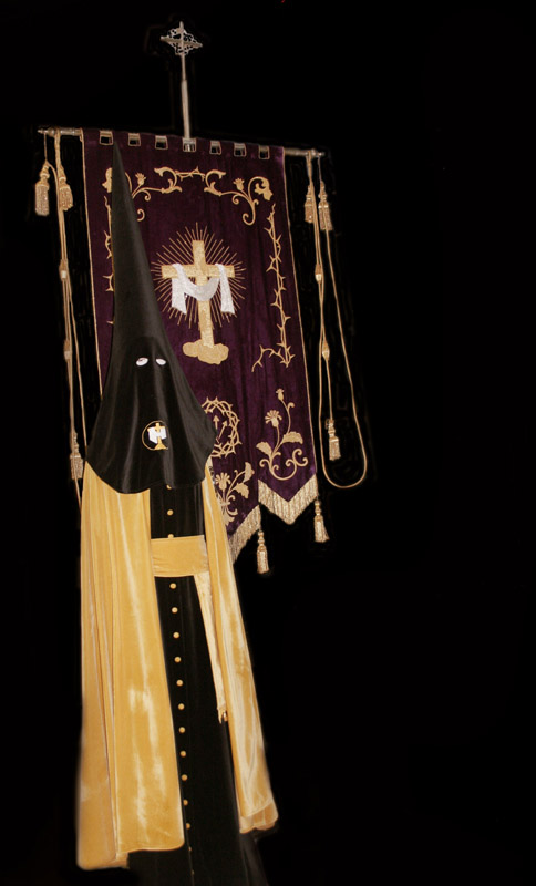 El estandarte de la Hermandad está realizado en terciopelo granate y bordado en hilo dorado. Se representa en el centro la Santa Cruz sobre una base que imita el suelo. Una sábana blanca cuelga de ella, y alrededor líneas que forman destellos; debajo de esta Cruz la corona de espinas y los clavos, elementos de La Pasión. Motivos florales en los bordes. De la base del estandarte y formando tres flechas cuelgan borlas y flecos. En la parte trasera aparece bordado el nombre de la Hermandad de la Santa Cruz y en números romanos la fecha de confección : II-III-MCMLIII. Las autoras del estandarte fueron las Monjas Concepcionistas. |